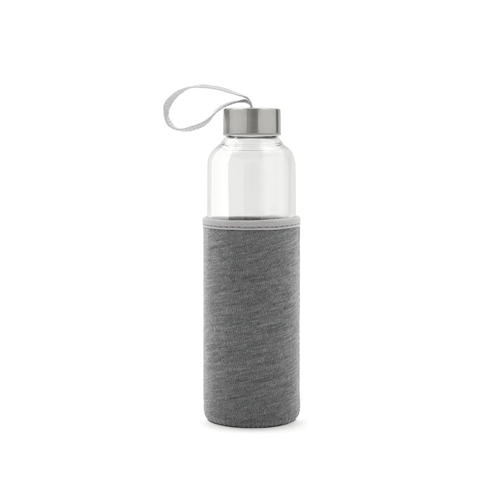 Botella fabricada en vidrio borosilicato, un material resistente y duradero. Cuenta con una funda protectora de neopreno brindando un diseño práctico que protege contra golpes. Su tapa a rosca incluye una cinta integrada, ideal para un transporte cómodo y seguro.