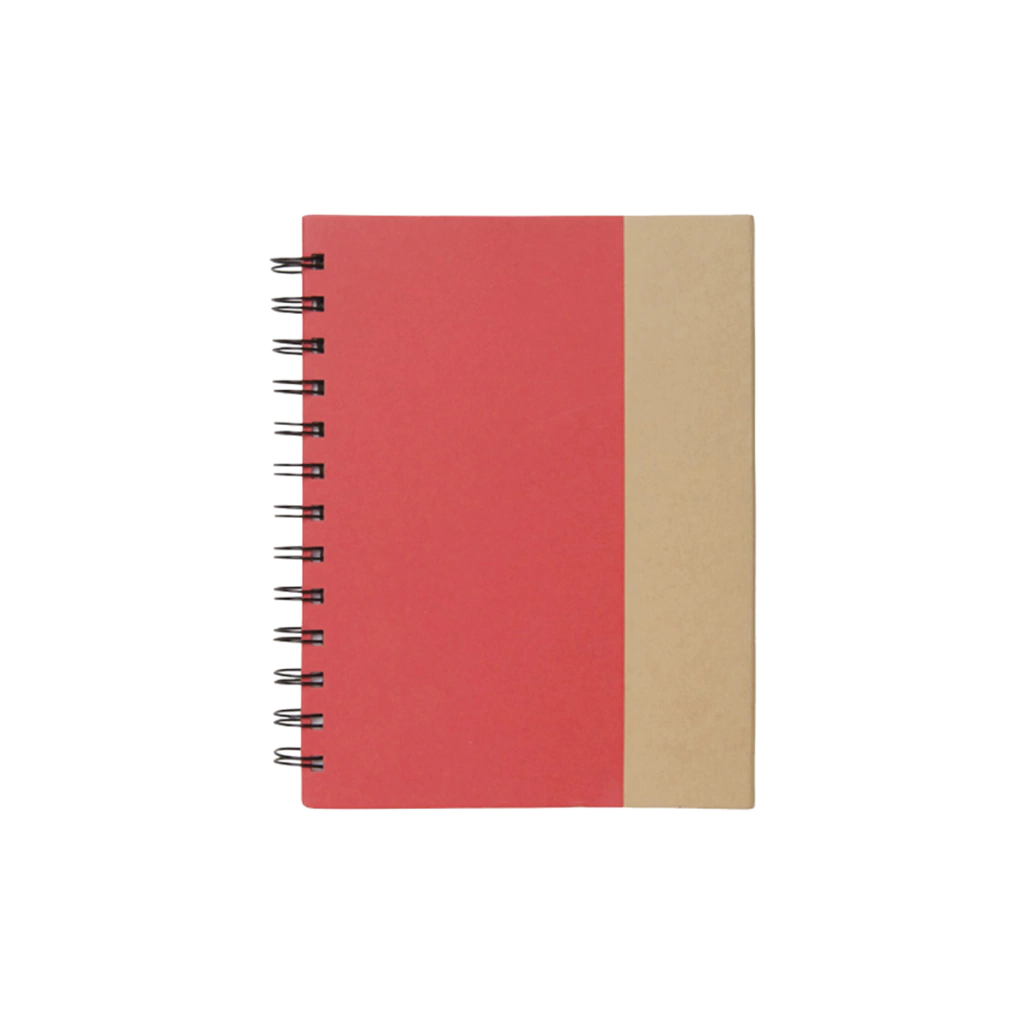 Cuaderno de cartón ecológico con espiral. Dos autoadhesivos rectangulares (grande y mediano), cinco autoadhesivos señaladores de diferente color y bolígrafo de 14cm con detalles a tono incluído.