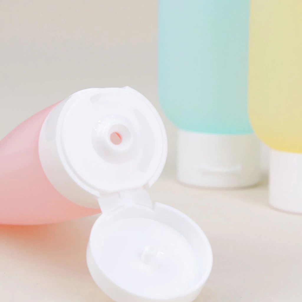 Set de 3 botellas de plástico de 60ml en colores surtidos, vienen con una bolsa de PVC con cierre tipo ziploc.