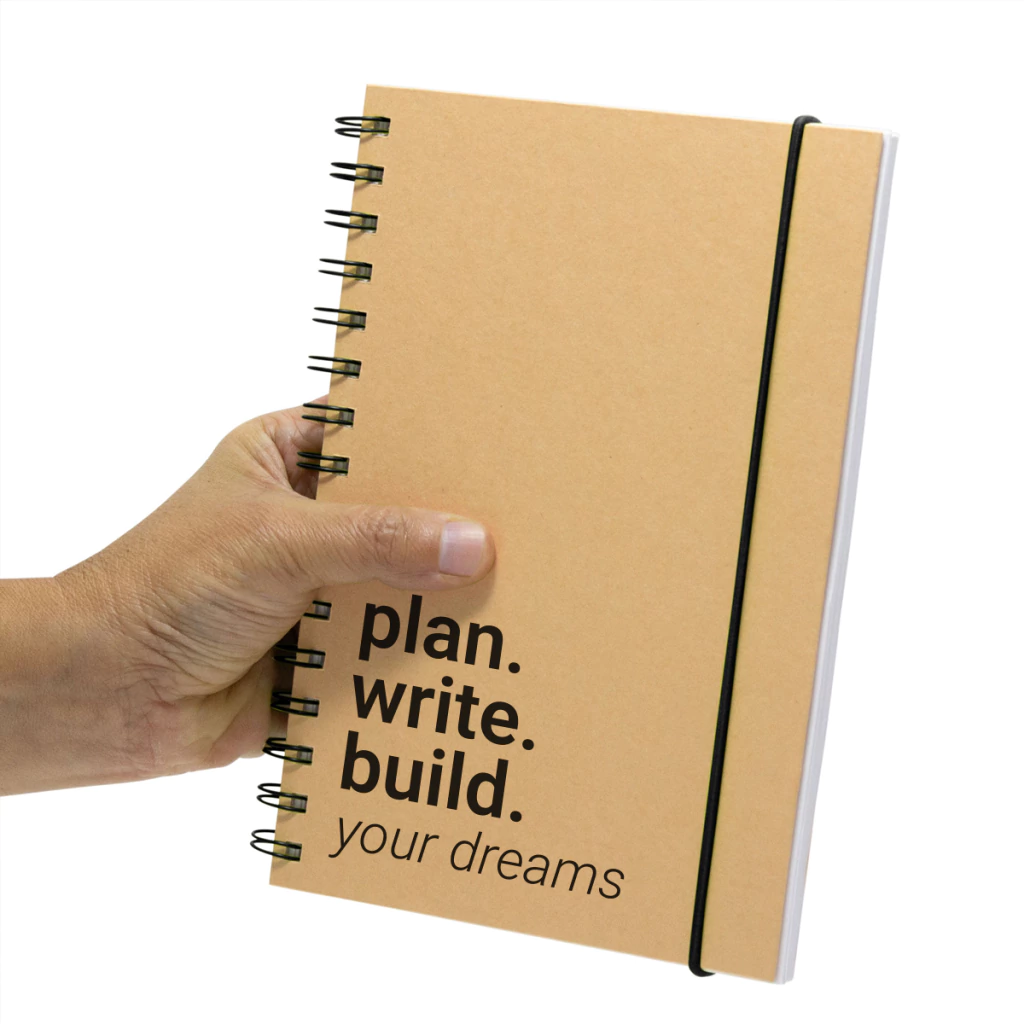 Colección especial impresa de esta hermosa libreta espiralada eco-friendly: Tapa recubierta en papel kraft de 120 g. Interior de 70 hojas blancas rayadas de 80 g. Cierre con banda elástica y espiral del mismo color.