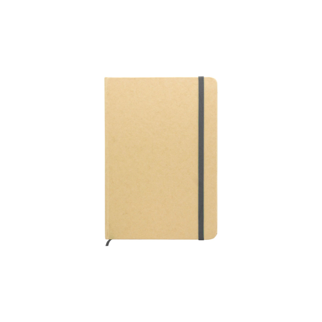 Hermosa libreta ecológica con tapa en papel kraft. Interior con 80 hojas rayadas en papel de 70 g. Cinta señaladora y cierre elástico del mismo color.